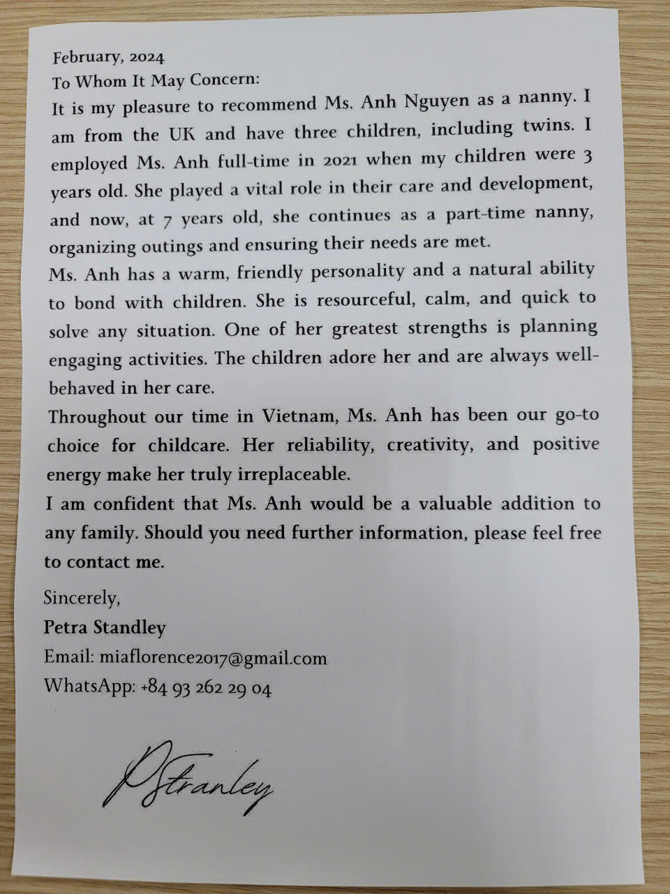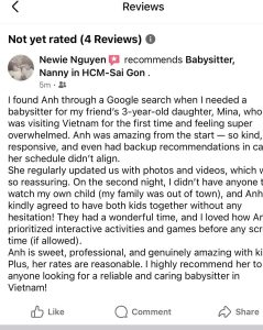 Trusted Referrals in Other Cities: I am part of a small group of experienced, independent babysitters. We know and trust each other, and we often introduce our clients to one another. If your travels take you to Ha Noi, Da Nang, Phu Quoc, or Hoi An, I am happy to connect you with a caregiver whom I personally trust and recommend.