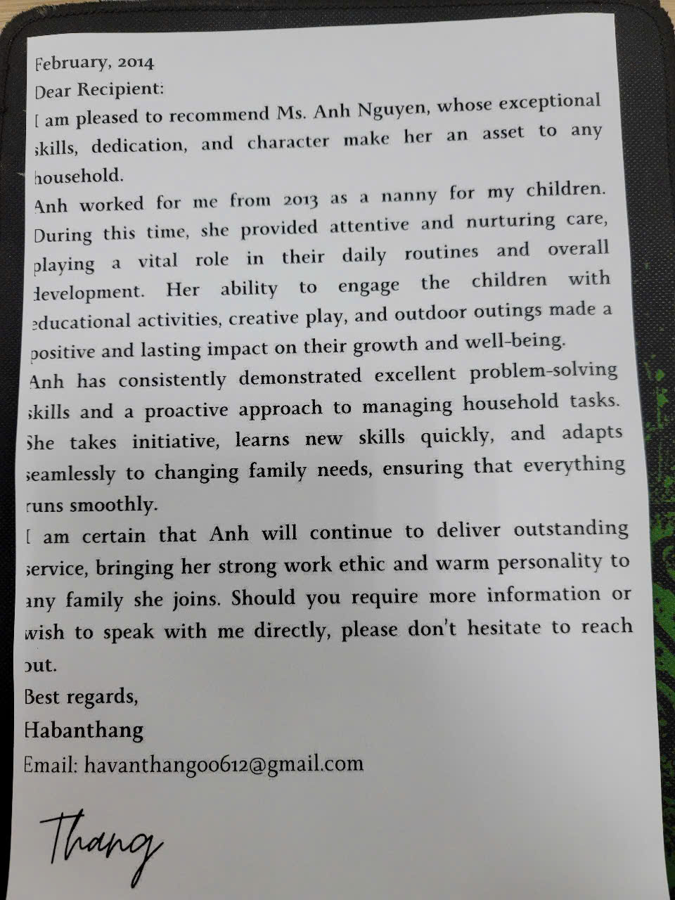 My name is Anh, and I offer personal, independent babysitting services tailored specifically for foreign families, particularly those traveling for holidays. With 16 years of dedicated experience in caring for children from diverse cultural backgrounds, I bring a wealth of knowledge and skill to ensure your child’s safety and happiness, no matter where you are.